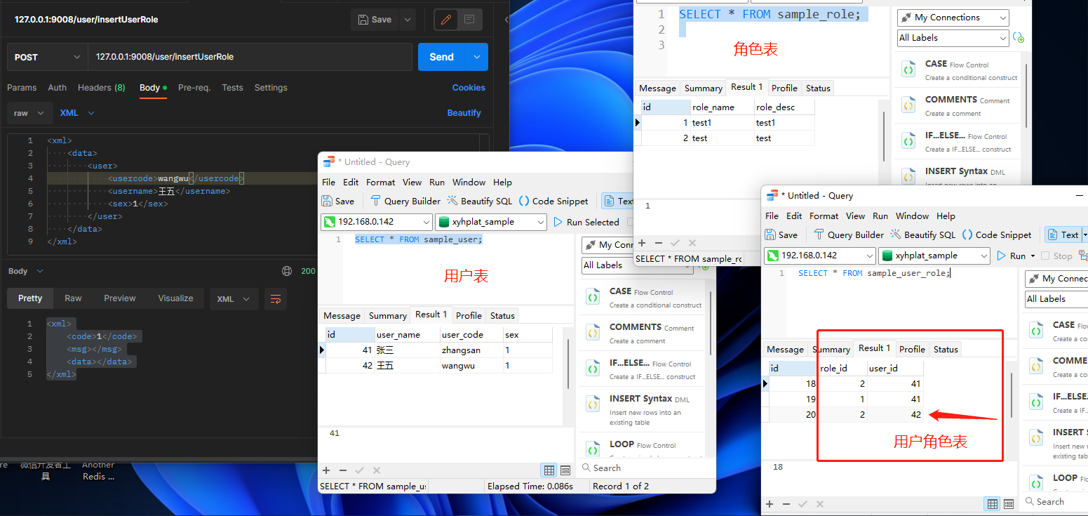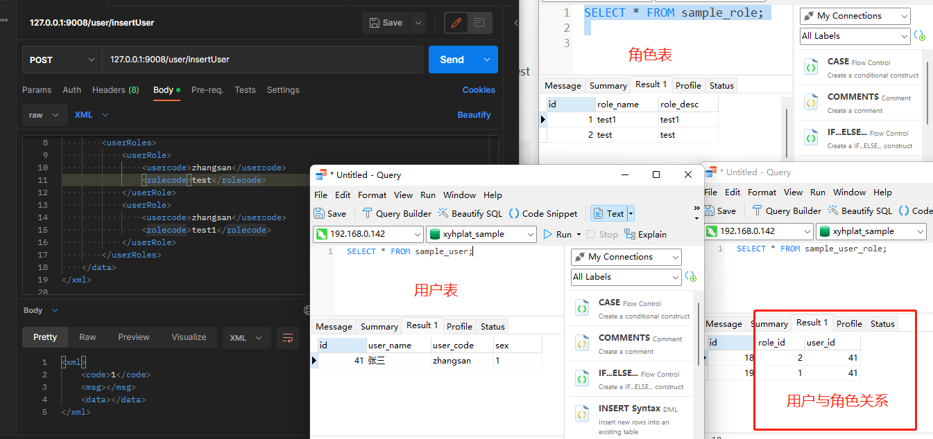 分析: No.1 插入用户表->张三 (sample_user) No.2 根据角色code查询角色id (sample_role) No.3 将角色id和插入后的用户id 用户和角色关系表 (sample_user_role)