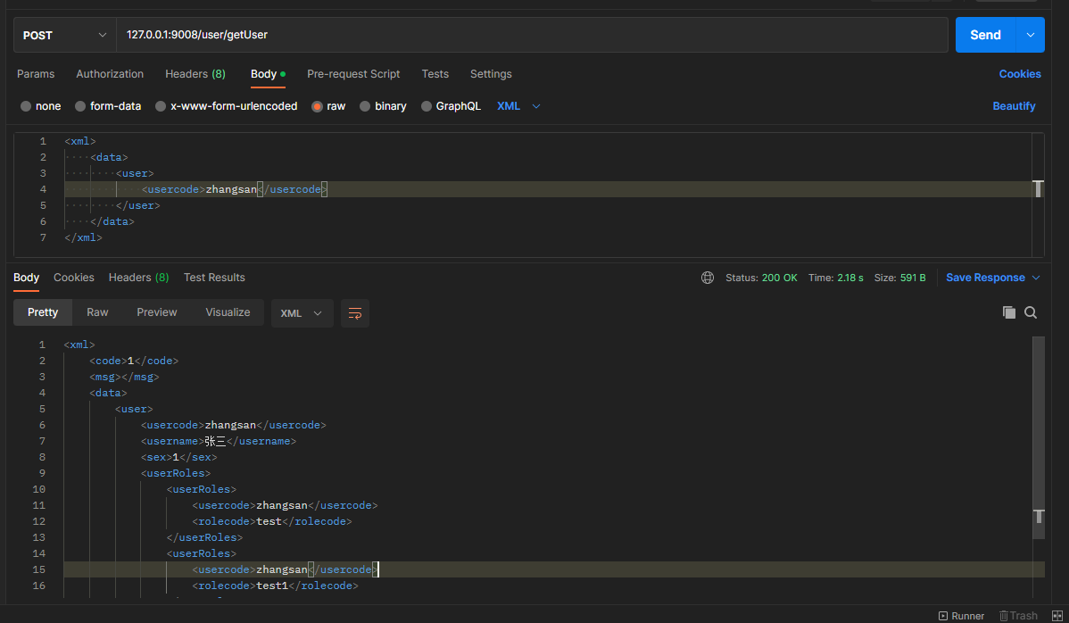 1 2 3 4 5 6 7 <xml > <data > <user > <usercode > zhangsan</usercode > </user > </data > </xml >